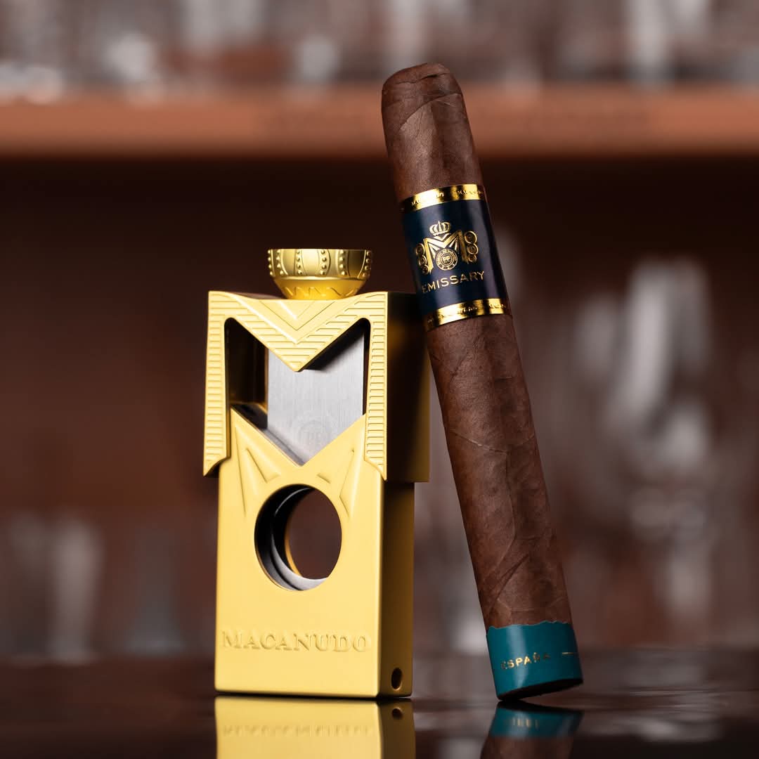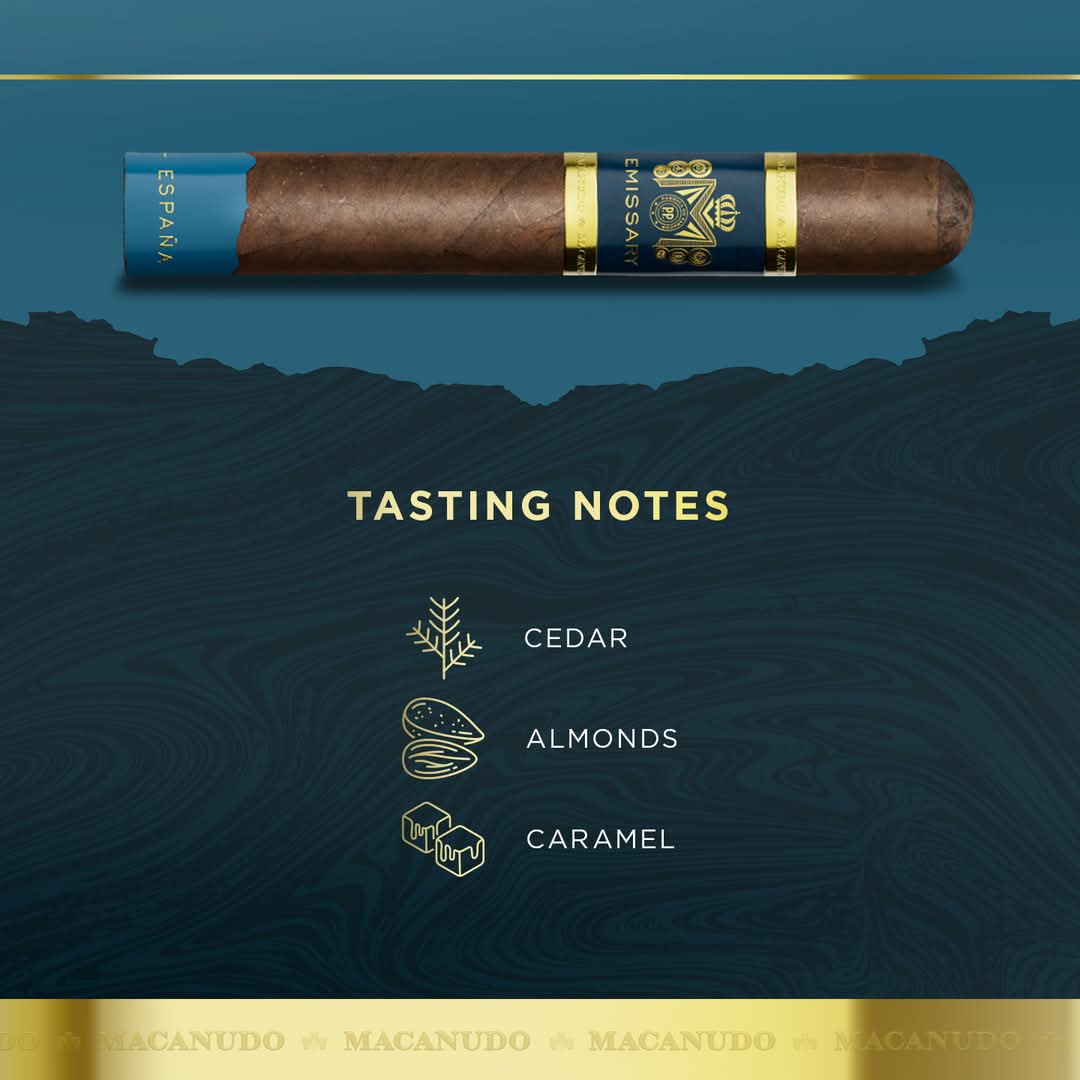 Macanudo Emissary España uses a harmonious five-country blend highlighted by a Havana seed grown near the town of Riolobos, Spain. The region’s rocky soil and Mediterranean climate yield a rich tobacco that cannot be replicated. Grown near olive trees and pepper fields used for paprika, the tobacco is characterized by thick, oily leaves from the warm, dry summer days and mild nights. When combined with the rocky soil, the result is tobacco with intensity and complexity.
